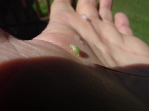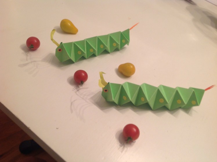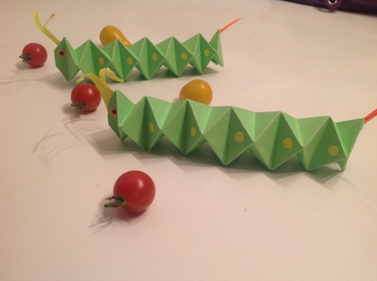 If you take your folded paper prior to gluing, add some antennae, eyes, spots and a tail, you can make a flexible caterpillar like these tomato worms. If you vary the colors and spots you can make several different kinds of larvae from many different species, they pair well with Origami butterflies.