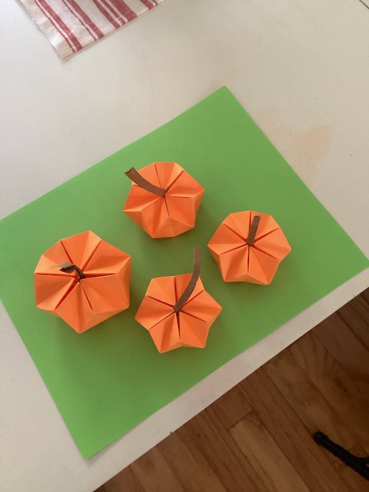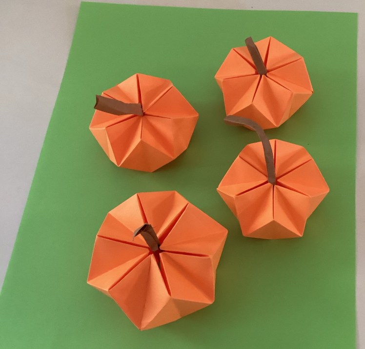 Just use orange paper for the flexagrams and add a strip of brown paper for the stems, add a face with a Sharpie if you want to use it for a Halloween centerpiece.