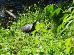 Notice that more than one species can occupy the same area. This big guy must be at the top of the pecking order. Turtles love to lay out in the sun to warm up.