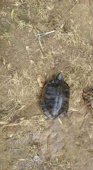 This is one of the most interesting turtles I have ever caught. Notice the red and yellow on the plastron under its chin. I catch so many turtles in the small lake where I fish. Of course, I release them all back into the lake after examining them and making sure the hooks are removed.