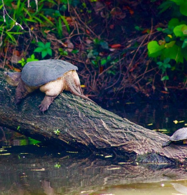 Interestingly, the Snapping turtles are actually good fishermen. They actually use a lure, part of their tongue that looks like a worm. As they wave it in the water with their mouths open, along come fish trying to eat the worm. Snap! Guess who becomes dinner?