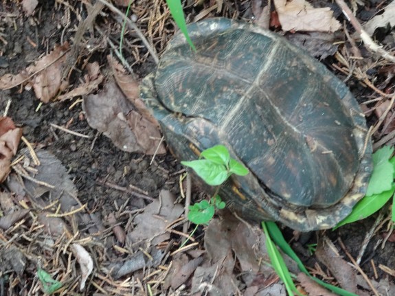 You might think it funny that I found these three turtles on top of a hill far from the water. They are actually terrestrial turtles. They live on land. These turtles have been found at altitudes as great as 6,000 ft. They prefer forests made up of both evergreens like conifers and cedars, and deciduous trees (those that lose their leaves annually) where the soil is moist and full of insects, worms, snails, slugs, and vegetation.
