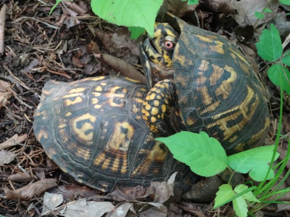 On a hike up the hill today, in the wooded area of Middle Tennessee, I came across an interesting situation. Apparently a battle had just occurred and the loser was upside down near a mating pair of Eastern Box Turtles. The smaller male as well as the larger one had come looking for the female following the pheromones she released into the air signaling that it was time for mating. The unfortunate loser was trapped on his back and couldn’t right himself. With legs kicking in the air, he quickly withdrew into his shell and snapped the door shut when I came near. After taking several photos and watching the process for awhile, I righted him and left him in the forest to fend for himself. Hopefully the next time he seeks a mate he will be a little bigger and wiser.