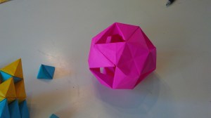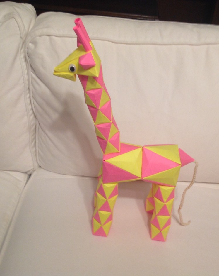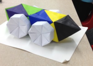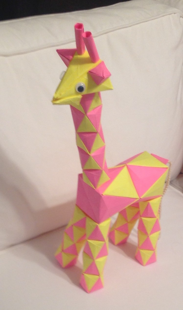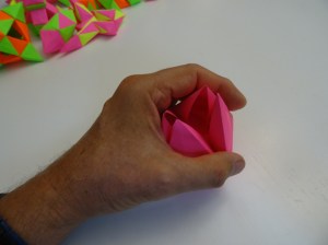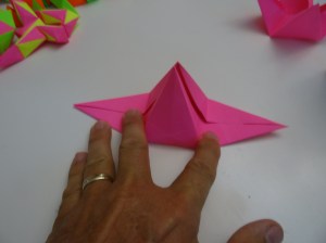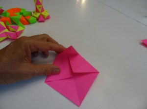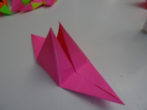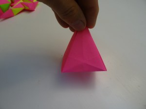 When I was in college my roommate and I liked to fold origami. One day, while working with the traditional German Bell fold, we tried to combine several units (50 or so!) to form a bigger sculpture. Even though we achieved the feat of making a large sculpture, we thought, “If only we could figure out a way to make the sides straight, we could construct even more shapes with sturdy sides.” Well, after fooling around a bit we discovered that if we only folded the point of each corner to the bottom of the side, we could make straight sided pyramids. Wow! What a difference it made!
