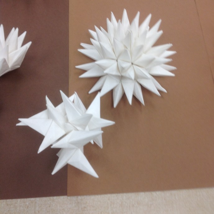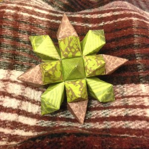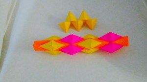 See what can be made from triangle units below. These were made with recycled computer paper from the days when the paper had holes along the sides to be pulled through the printer on sprockets.