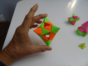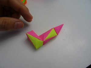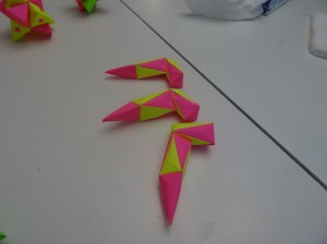 If you start with a triangle, instead of a square, you can make long, slender triangular pyramids. They can also be combined to make many interesting form. Here you can see some insect legs combining several units: