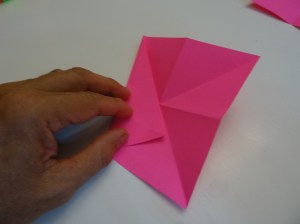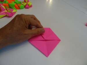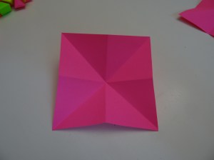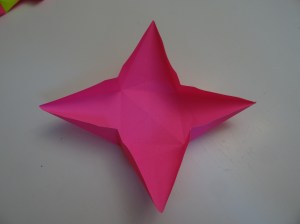 Pinch in the middle of each side and you should see the star shape above. Next, you will lift the four points up to form the pyramid.