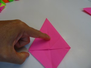 Repeat this on all four corners of the diamond. Don’t forget to fold the pointed ends back down on each corner. It may even look like it is already folded on one side, but it is not on the other. To check to see if you did it correctly, just look in the center of the diamond and you should see a square in the center. If one side of the square is missing, that is the point that needs to be folded back to the middle.