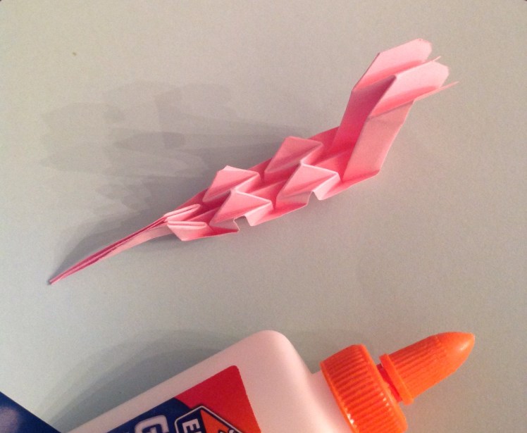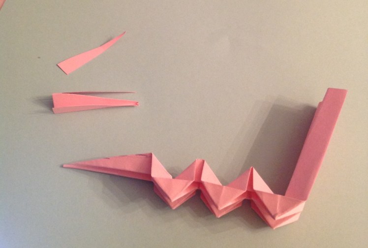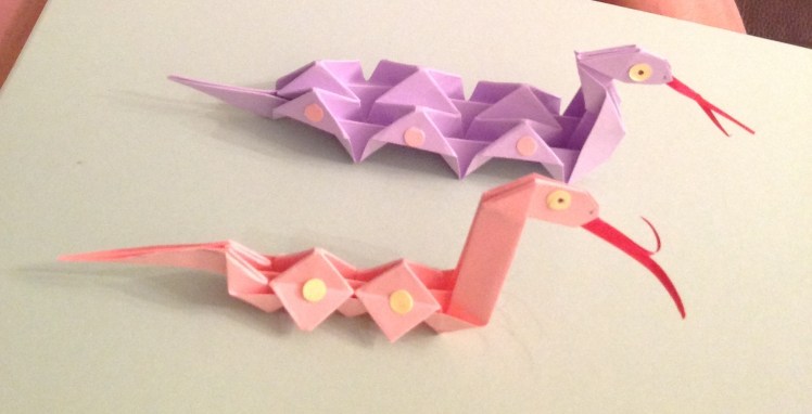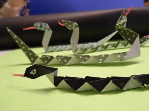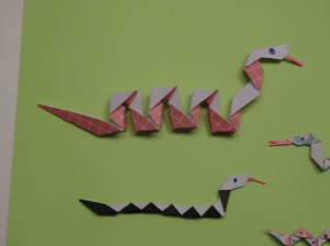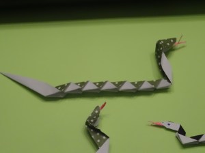 One of the interesting things you can make with the left over scraps of paper is snakes. These were all made with left-over strips of paper from other origami projects. All you need is a long strip of paper and knowledge of how to fold pop and hood folds, and snakes are in your future.
