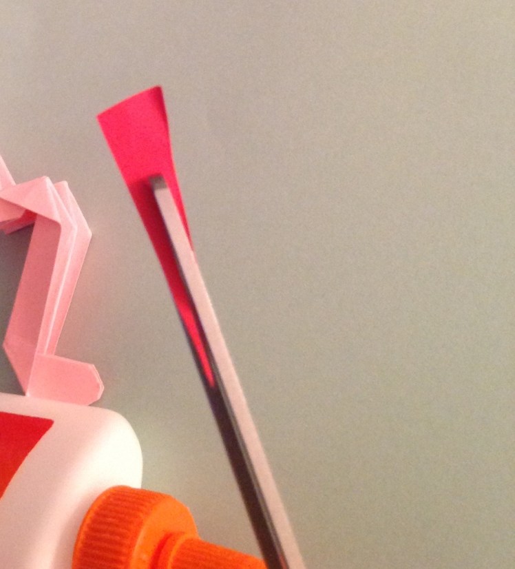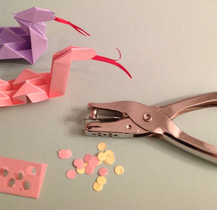 If you take a small piece of red or pink paper and slit it down the middle, leaving only a tiny section still attached, you can make a tongue. Curl it up and add a drop of glue and insert it into the head to make the tongue. The eyes can either be added with a felt tip or you can cut smaller pieces of paper and glue them onto the form. You can also add spots by using hole punched paper. Just a tiny drop of glue holds them in place.