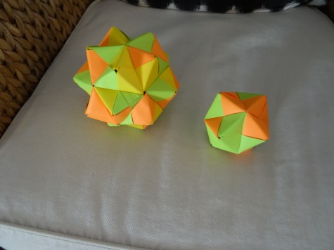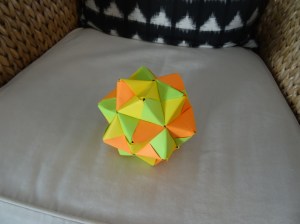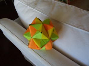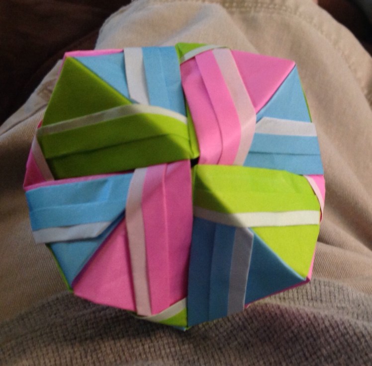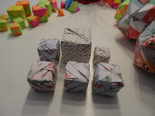 In order to begin you will have to fold up a couple jewels which require six Sonobe parallelograms, three unit for each jewel. Once you have formed your jewels, you are ready to go to the next step.