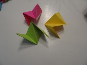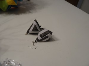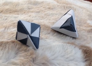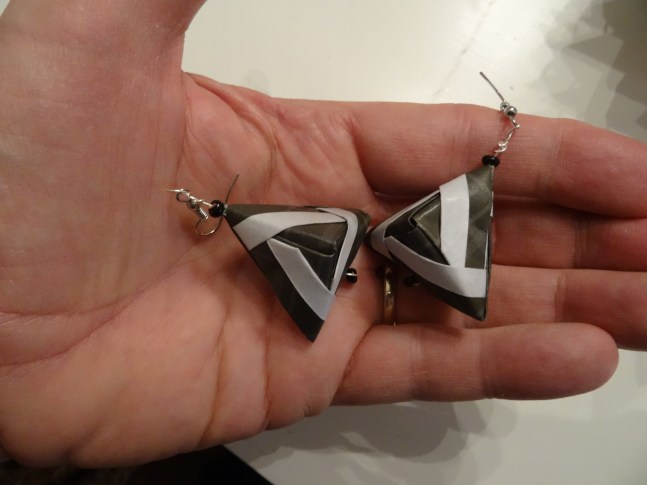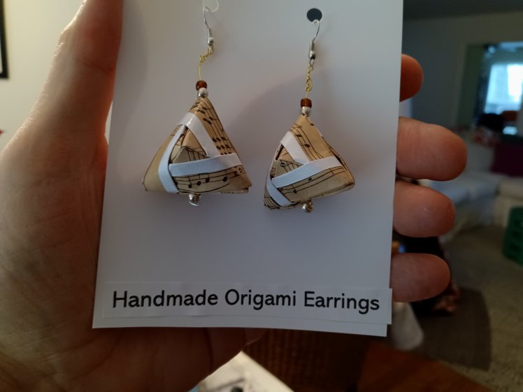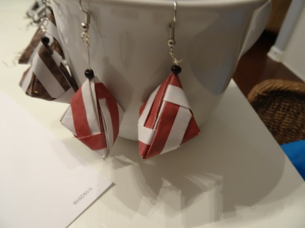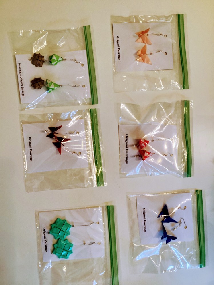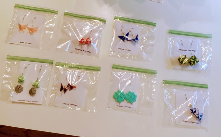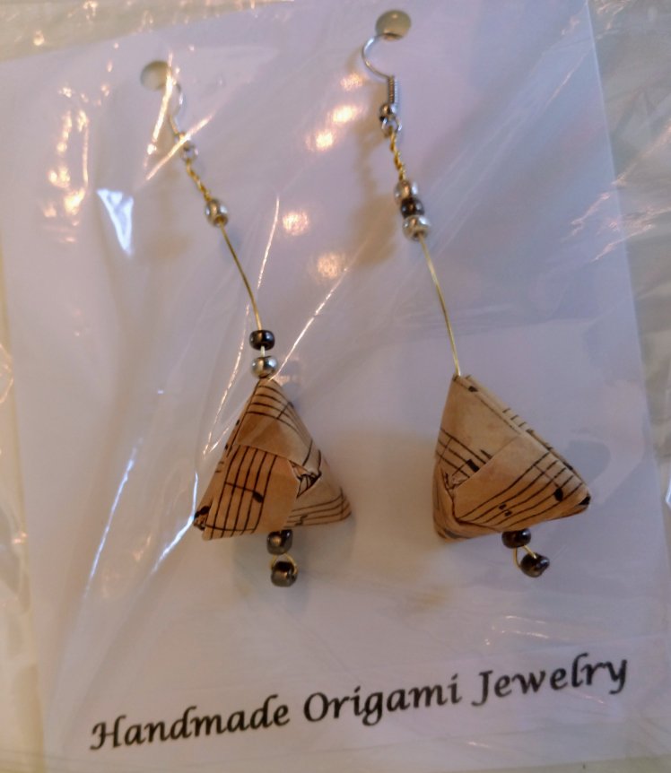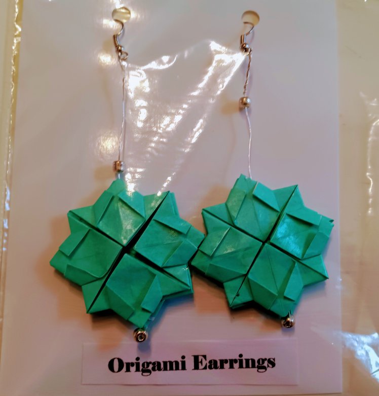 There are also many other origami forms that would be delightful in earrings. Butterflies, Birds, Sonobe cubes and more complex forms. The trick is that they have to be small which requires more skill to fold than larger forms. Take a look on-line under “Origami Jewelry” and you can see many other types of earrings, bracelets, necklaces and more.