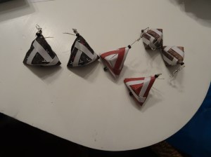 After you have constructed two earrings it is time to seal them with a coat of clear acrylic spray, or paint the surface with a coat of clear fingernail polish. This will make the form more rigid and render it water-proof. It also gives it a shiny surface.
