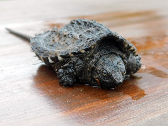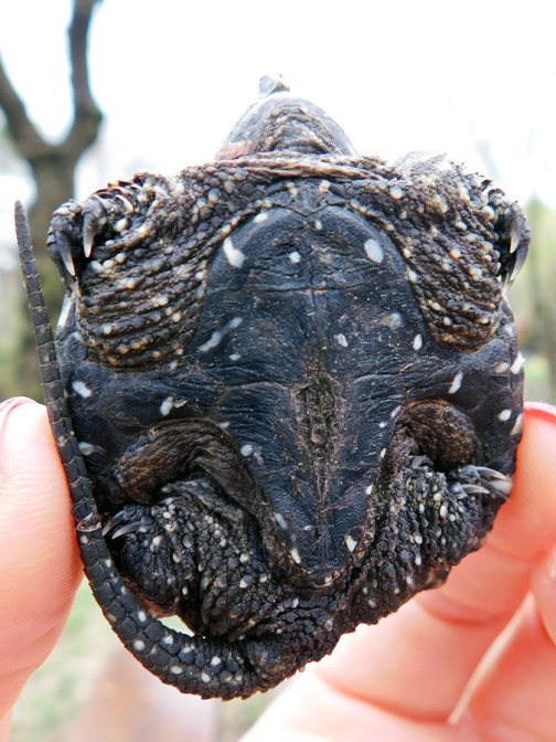This last week I received the pictures that are in this post. This little “snapper” was found while my friend, Danae Was cleaning out the garage in Arlington, Texas. You probably remember the blog post about the turtle survey we participated in at Spring Lake. The two large snappers that were seen in that blog are what the turtles look like when they grow up. You can also see pictures of even larger snappers in my earlier blog post. (I’ve included one at the bottom of this post.) So……let me show you the baby one: