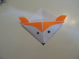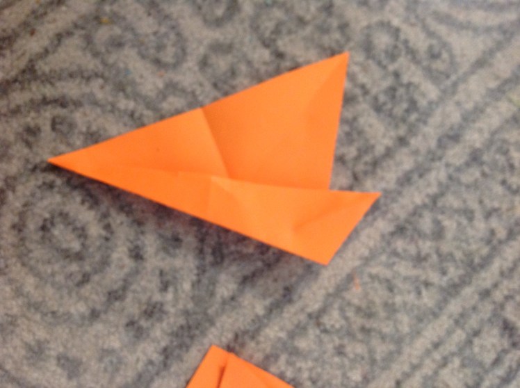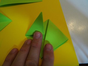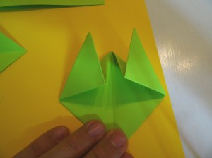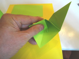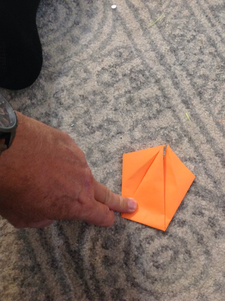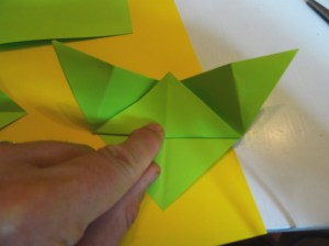 After folding the point, bring the sharp end back down to the blunt end and set a dark crease. Repeat this on each point. Hint: Don’t forget to fold end to end on the last point even though from the top it looks like it has already been folded. The crease is only on one layer and needs to travel to all levels. Easy way to check it: Look in the center of the large triangle and you should see a small triangle in the creases in the middle of the paper. If one side of the smaller triangle is missing that indicates the point that still needs to be folded back from sharp to blunt end.