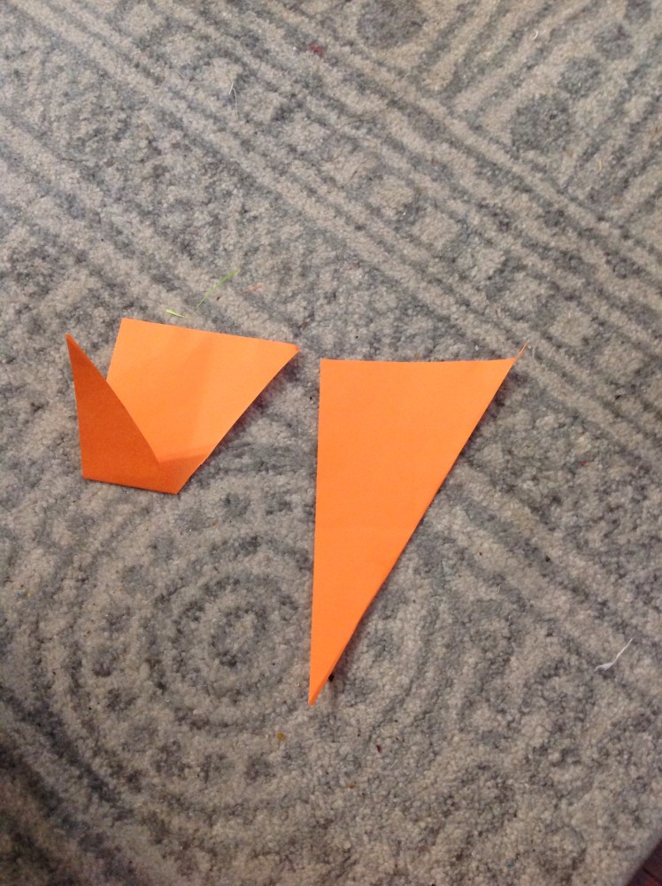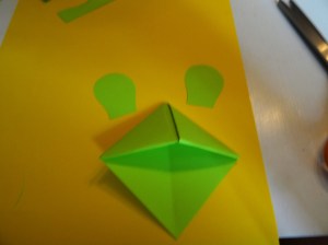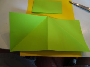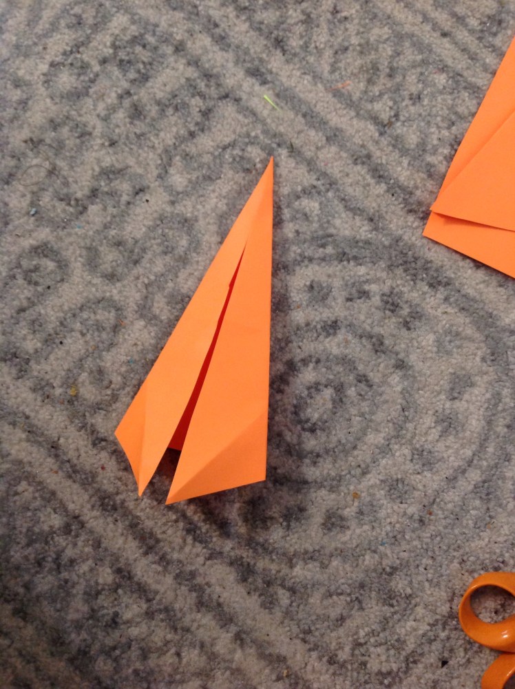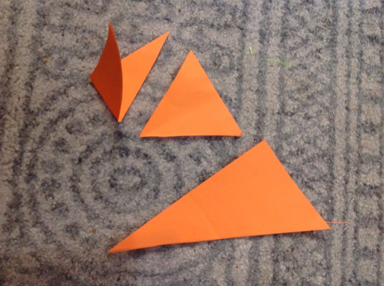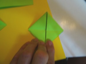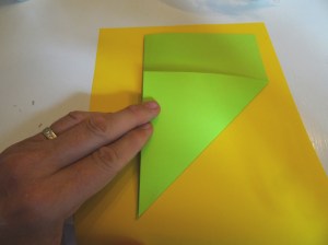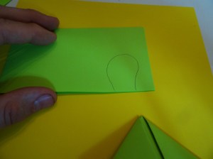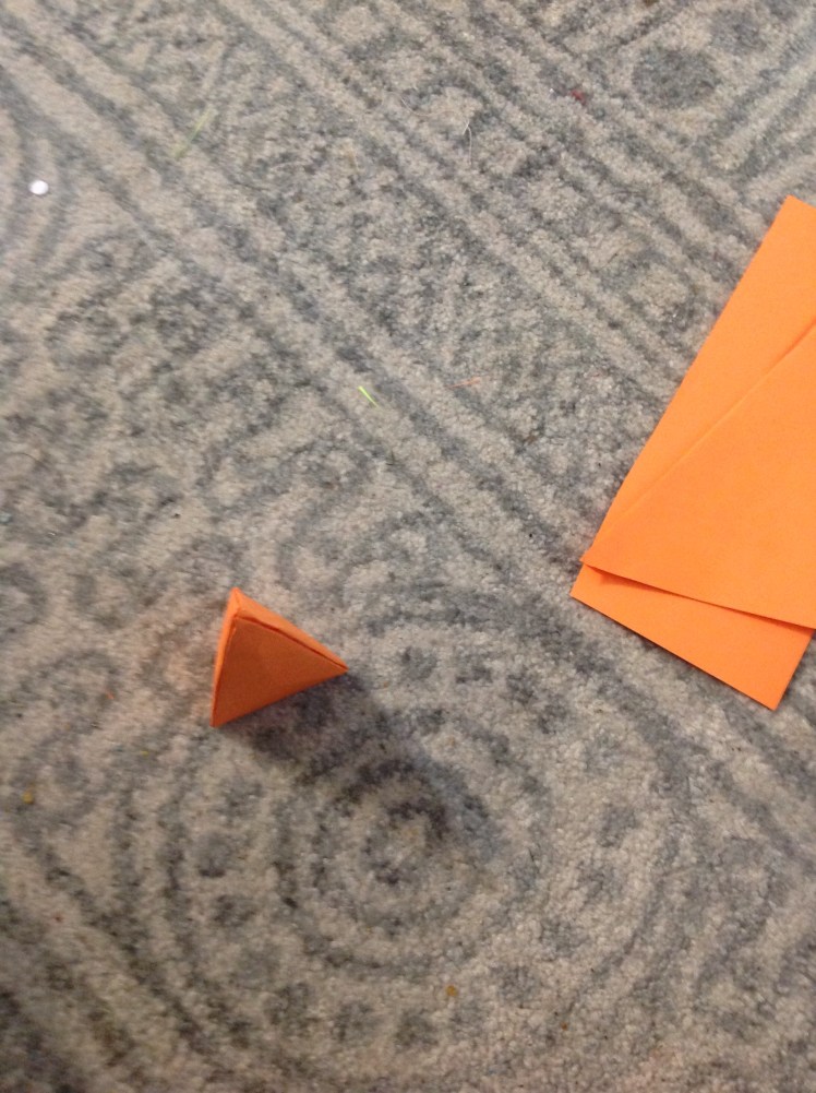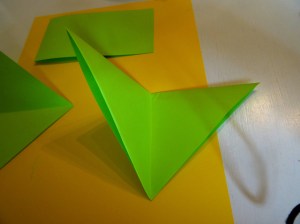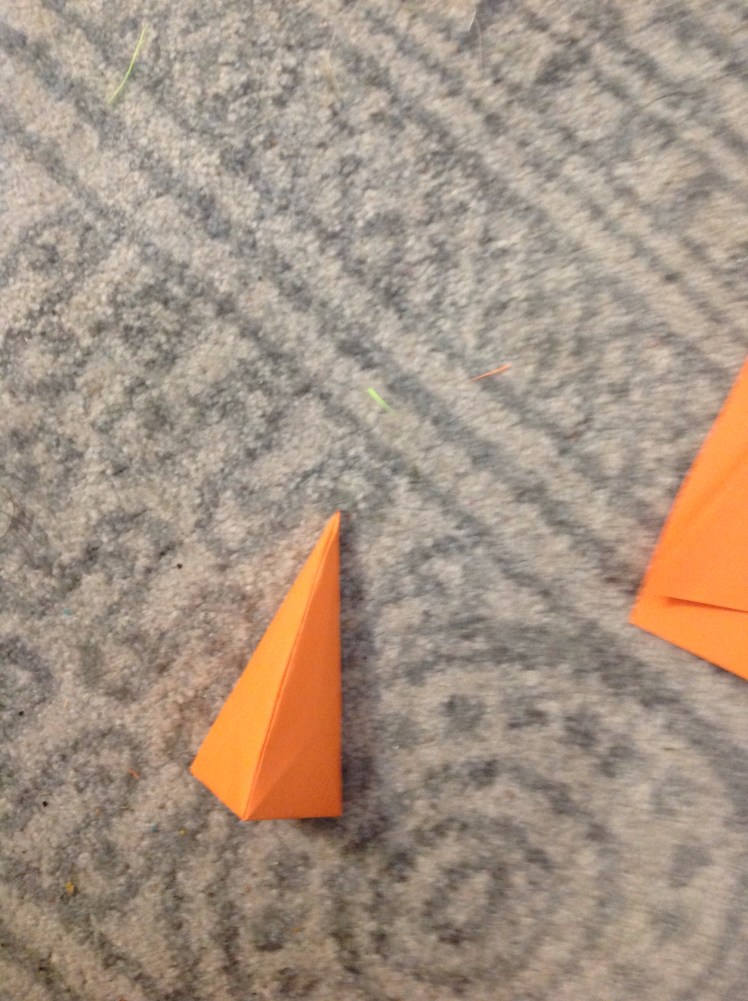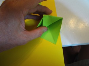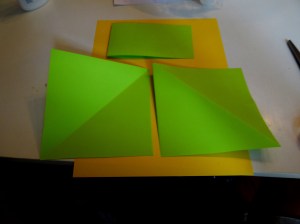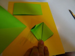 If you want to create some smaller pyramids you can take the side strips you cut off earlier and fold the point at the bottom to the top of the same side and it forms another pyramid. Just cut off the one side strip that remains. The pictures below show the process: