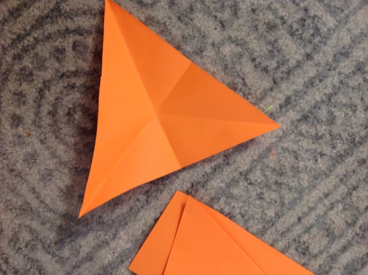 If you want to create some smaller pyramids you can take the side strips you cut off earlier and fold the point at the bottom to the top of the same side and it forms another pyramid. Just cut off the one side strip that remains. The pictures below show the process: