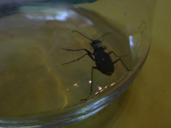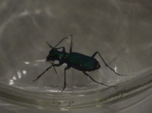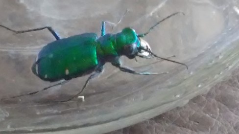 As you think about the many creatures you see around you it is not long before you see how important they all are to other organisms. Though these beetles eat many other types of insects and spiders, they also are the food of other creatures. As adults there are few creatures fast enough to catch them. I really had to be quick to catch the one I found for closer inspection.They are occasionally captured by spiders in their webs and also by birds. In their larva stage they are often dug up by skunks, moles, grackles, and sandpipers. Beetles are very high in protein needed by the organisms that eat them.