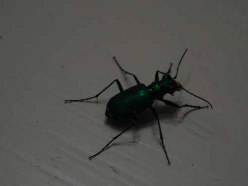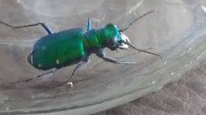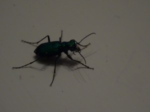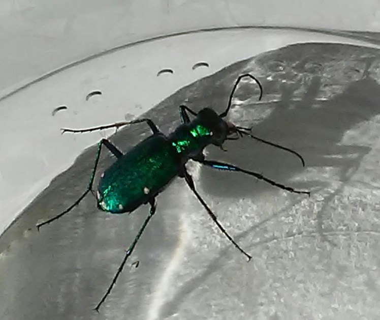 When I looked out of the garage door this afternoon I spotted what looked like a shiny emerald streaking across the blacktop. On closer Inspection I discovered it was an iridescent green tiger beetle.