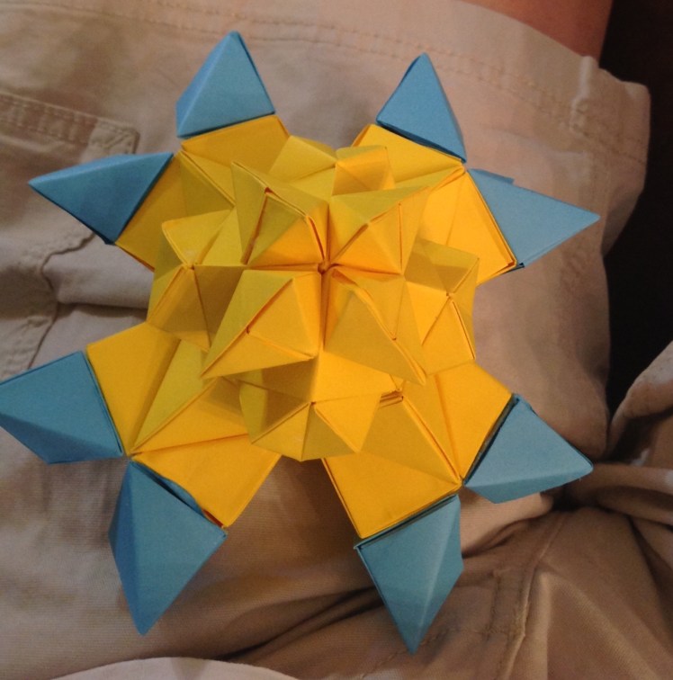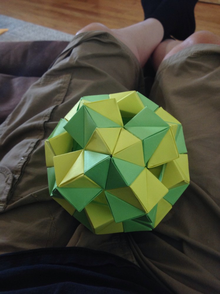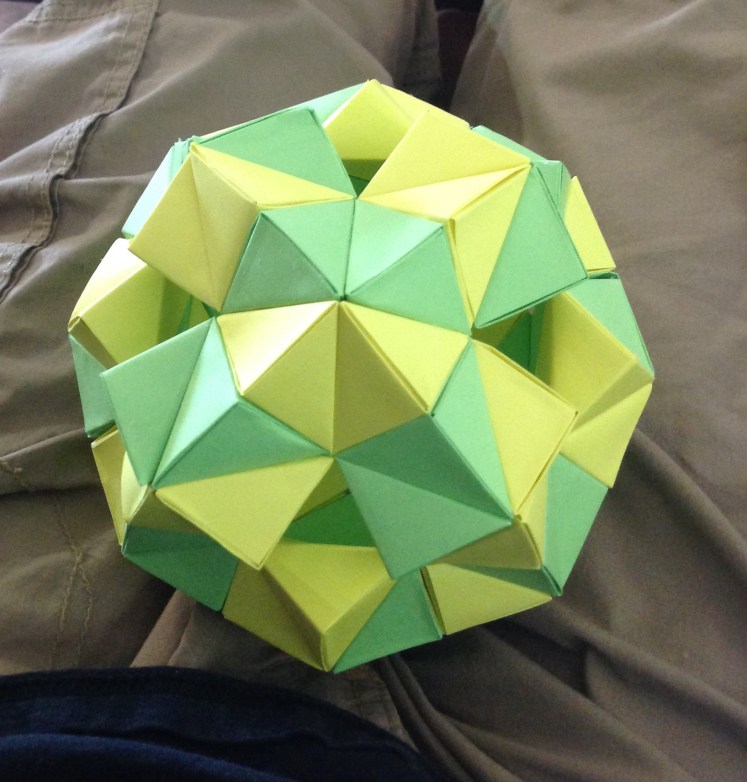 In this project we had to fold 28 units and glue them together. Then we put them together by twos to create hemispheres. We took 8 of the hemispheres and combined them to make a wreath.