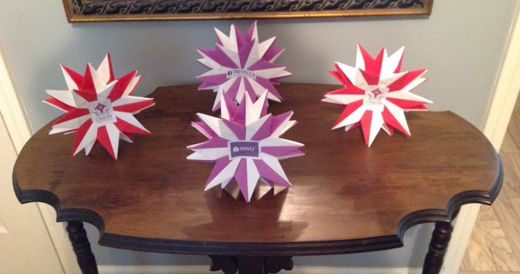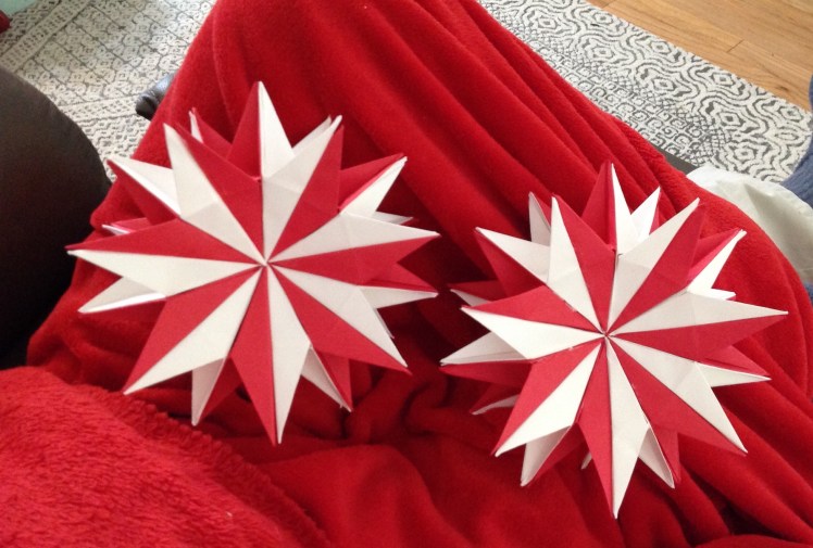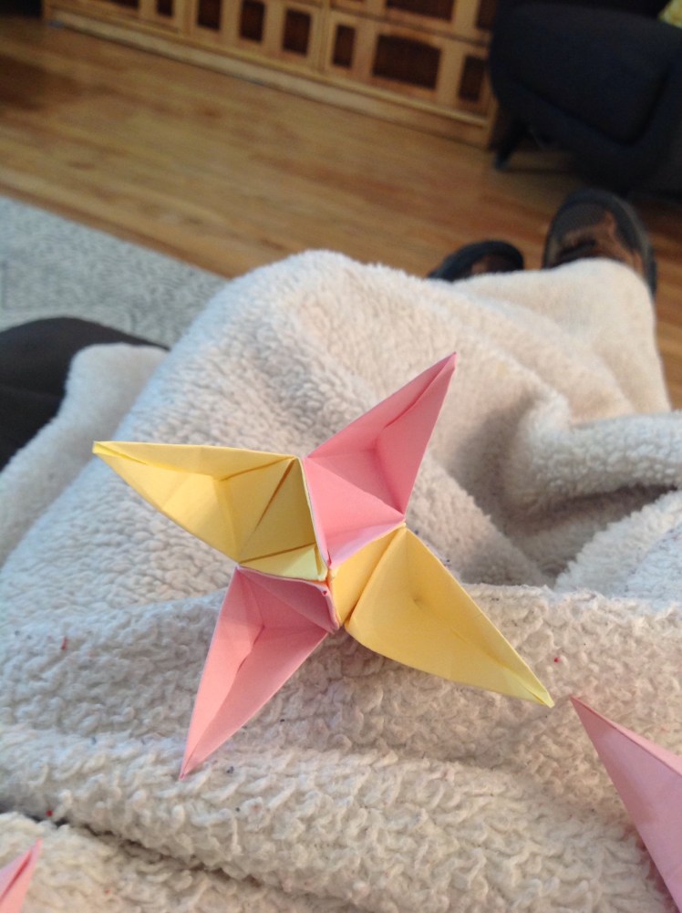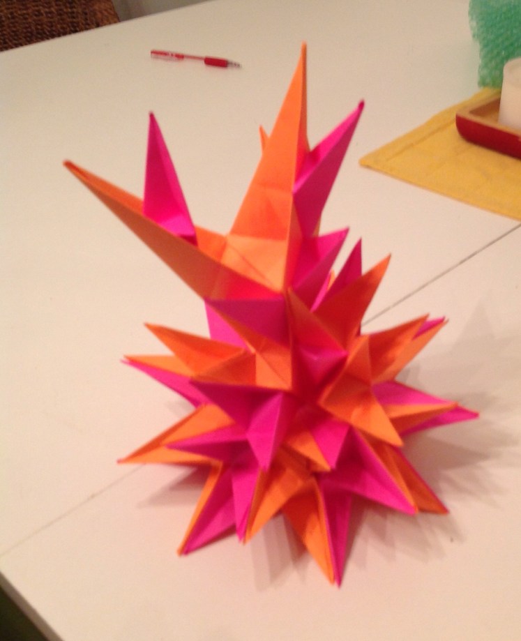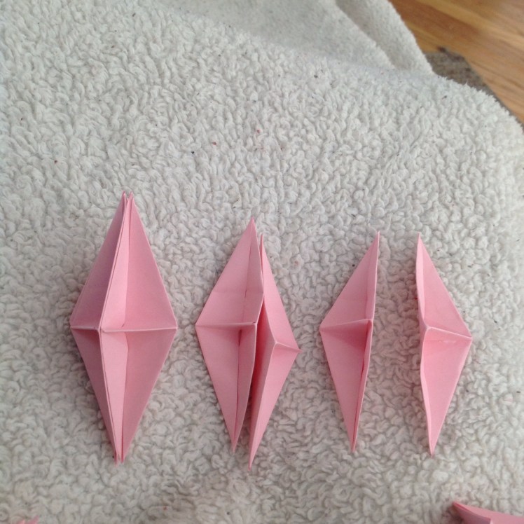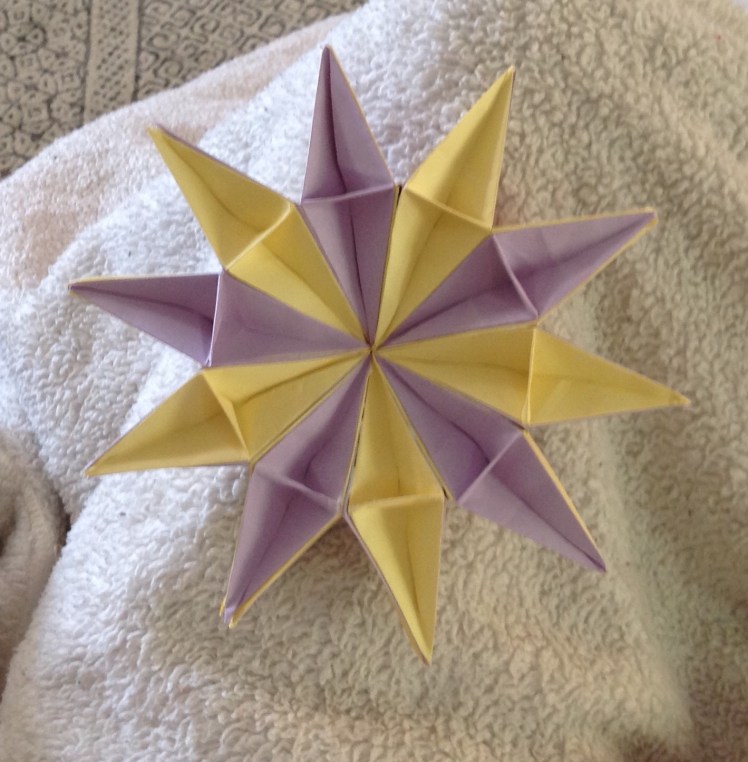 On the left side of the picture above you can see the four-sided double-pointed units. It takes four pieces of paper to form each spike, and takes 30 pieces of paper to create the ten-pointed star. Remember that a little glue goes a long way. Don’t use too much or it will take too long for the glue to set.