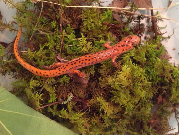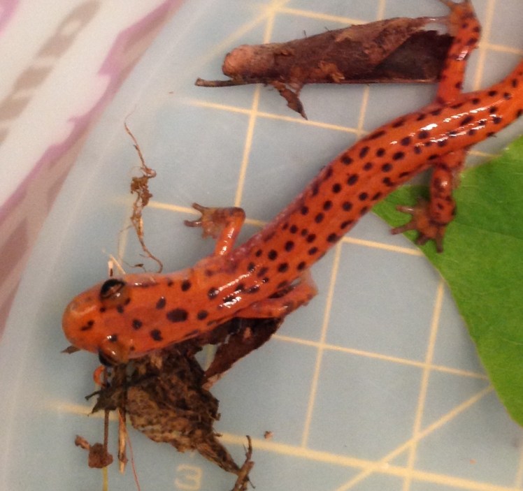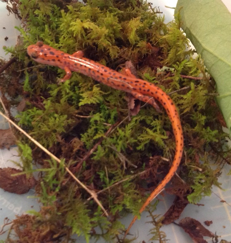 As you have probably learned in your science classes, the amphibians are the only vertebrate animals that undergo metamorphosis, the changes in form from birth to adulthood. Like frogs, salamanders also go through change. The newly hatched young have gills and often are completely different in color and shape from the adults. In this stage of their lives they feed on microscopic crustaceans and insect larvae, especially the larvae of flies and mosquitos and other Diptera species. Just think how many more annoying mosquito bites we would face if these little guys were not on duty! After anywhere from 6 to 18 months the young change into their adult stage. Being larger and able to move around out of the water allows the salamanders to widen their diets. As adults they eat arachnids like spiders, ticks, and mites. They also chow down on many kinds of insects and crustaceans. They also like worms.