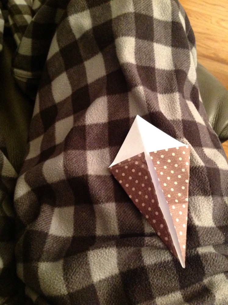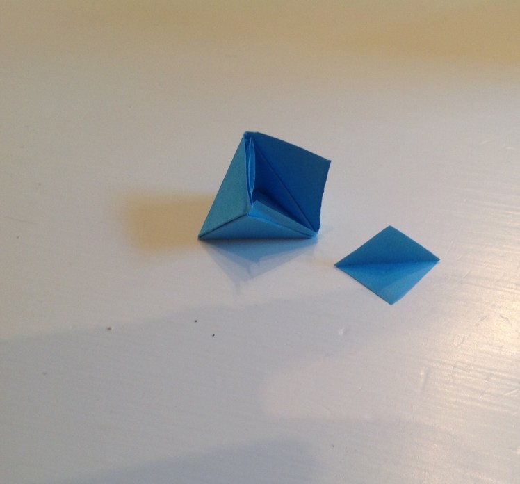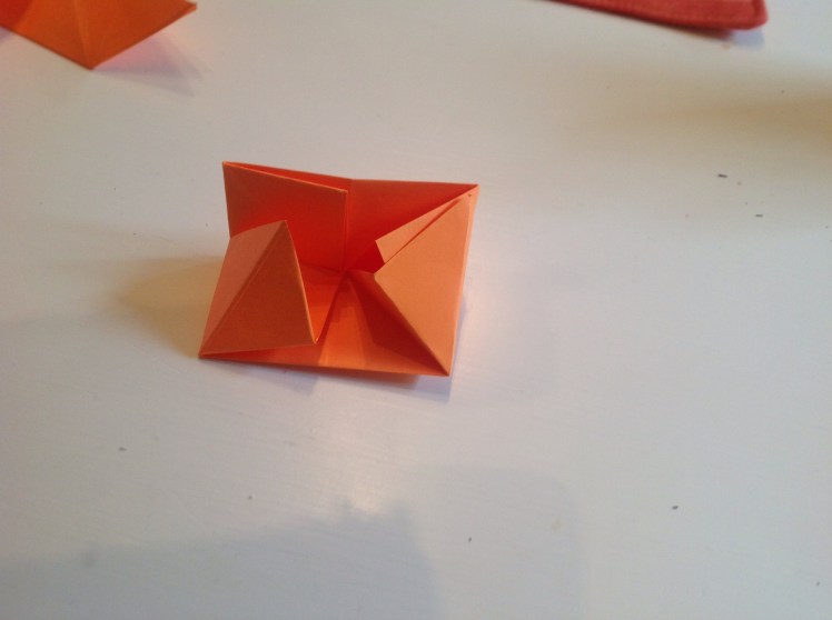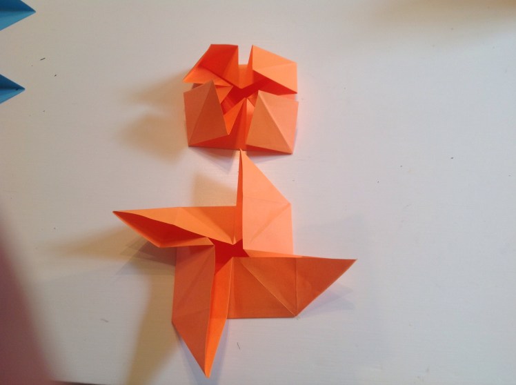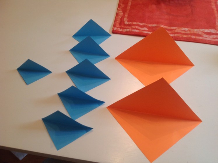 For each of the large and the six smaller squares you will be folding them into pinwheel bases. (If you don’t know how to fold the pinwheel base you can easily find it by looking on line. It is a traditional Origami base unit.)