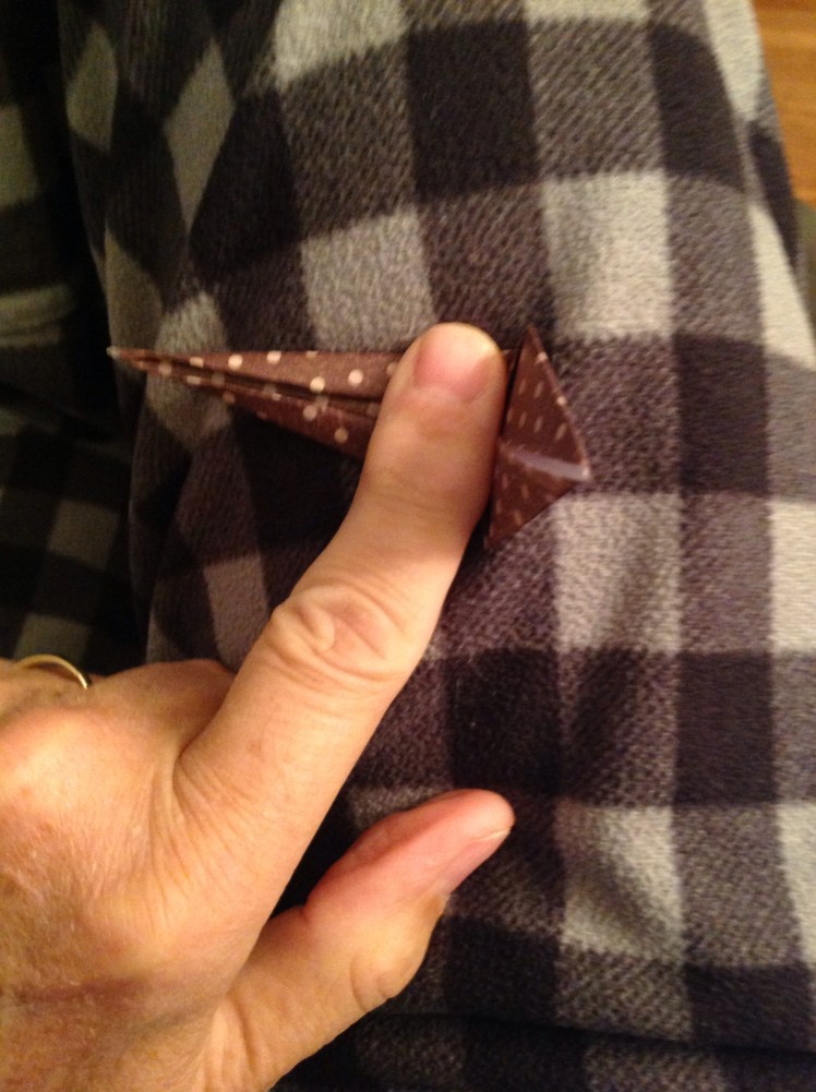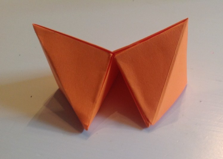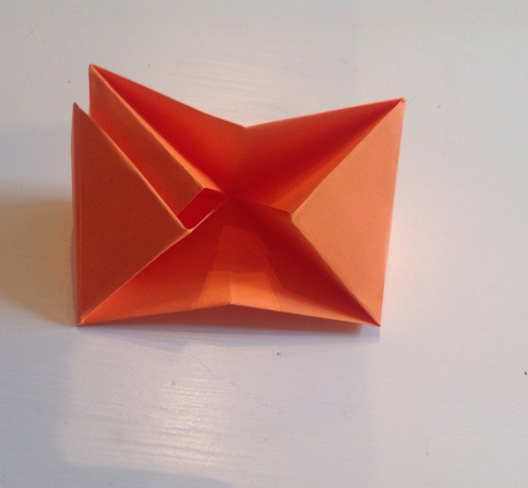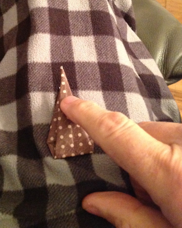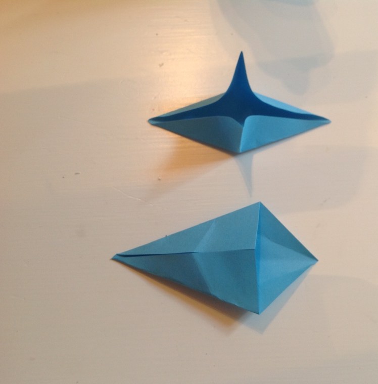 To make the tail unit you will use the smallest square. Place it like a diamond and fold an airplane Point on one end. Open the paper and fold another airplane point on the opposite end. Now bend the unit in half. Pinch up the two middle triangles as shown below.