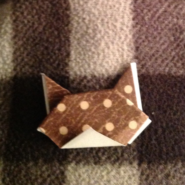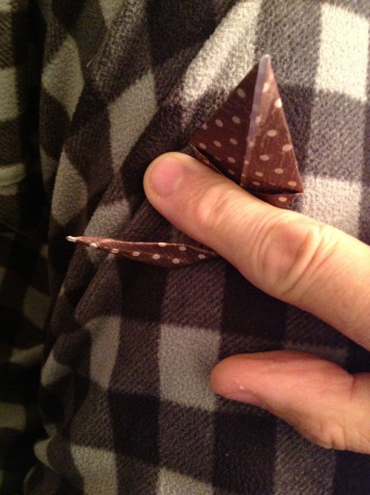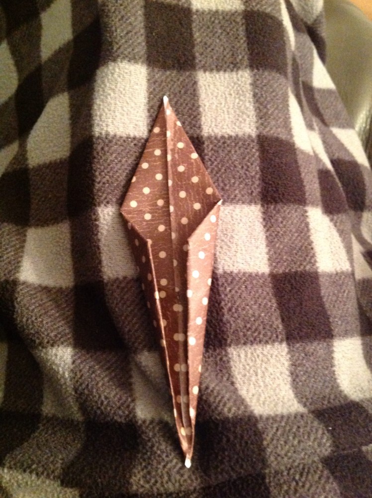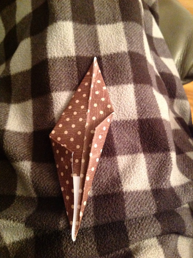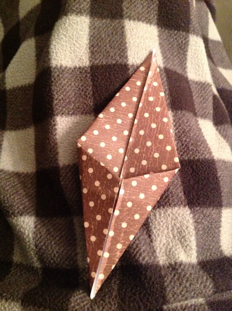 To make the tail unit you will use the smallest square. Place it like a diamond and fold an airplane Point on one end. Open the paper and fold another airplane point on the opposite end. Now bend the unit in half. Pinch up the two middle triangles as shown below.