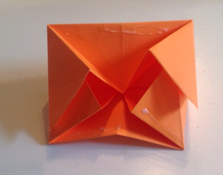 You will next have to fold the four points of the pinwheel up like a shark fin. Then push them down so that all the points face the middle as seen in the above picture.