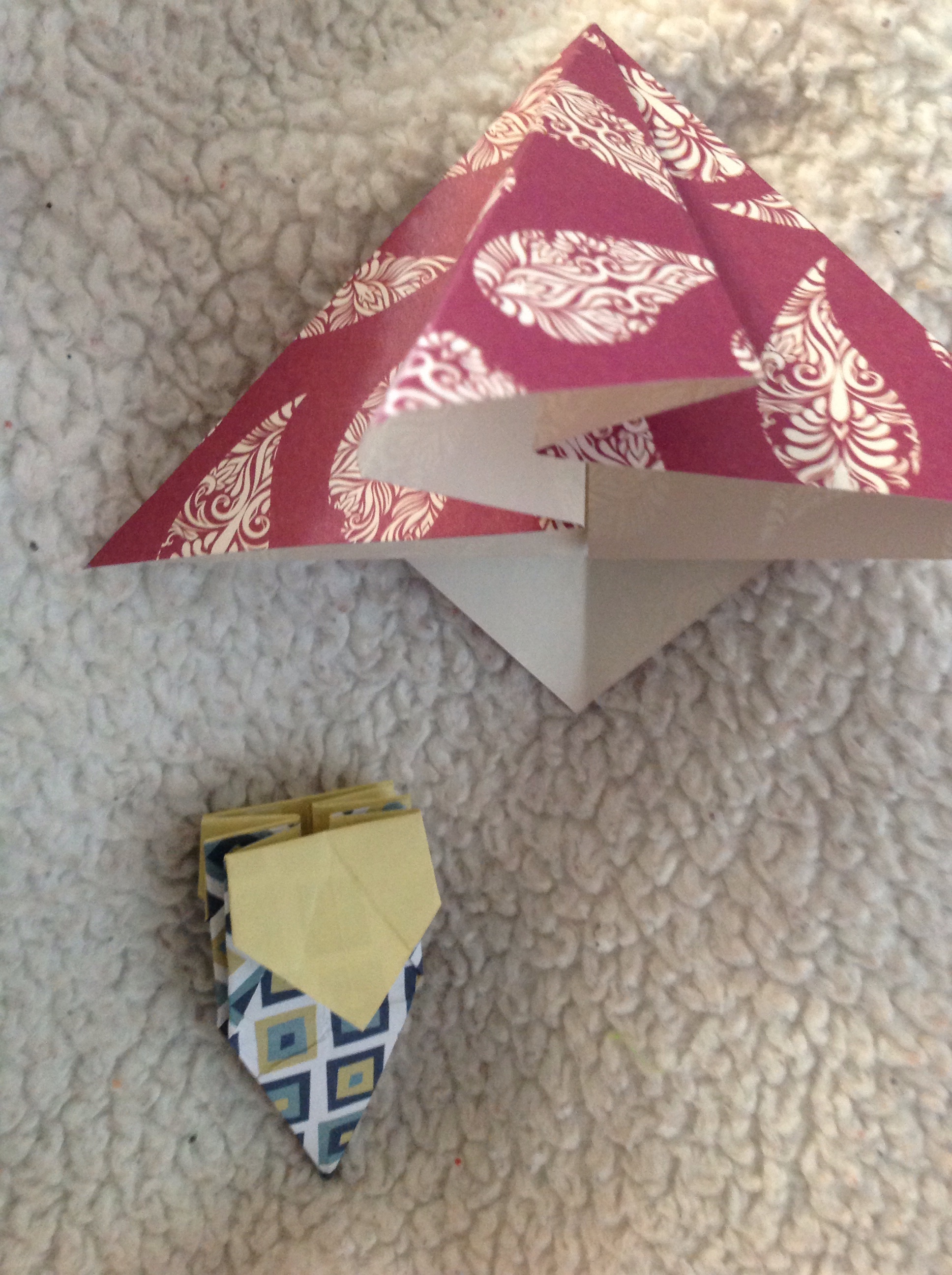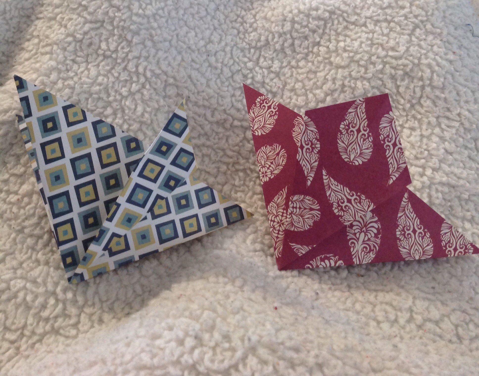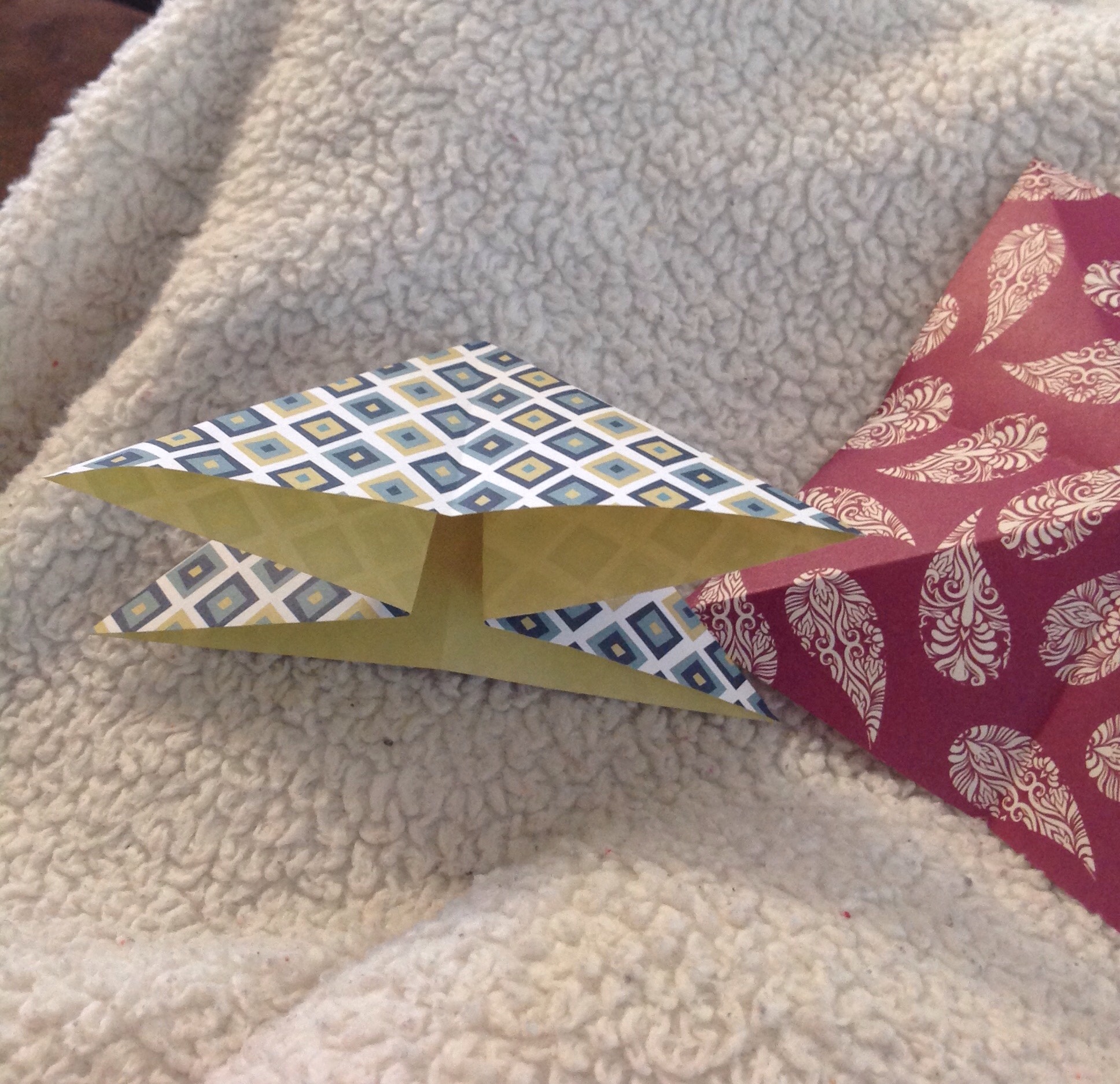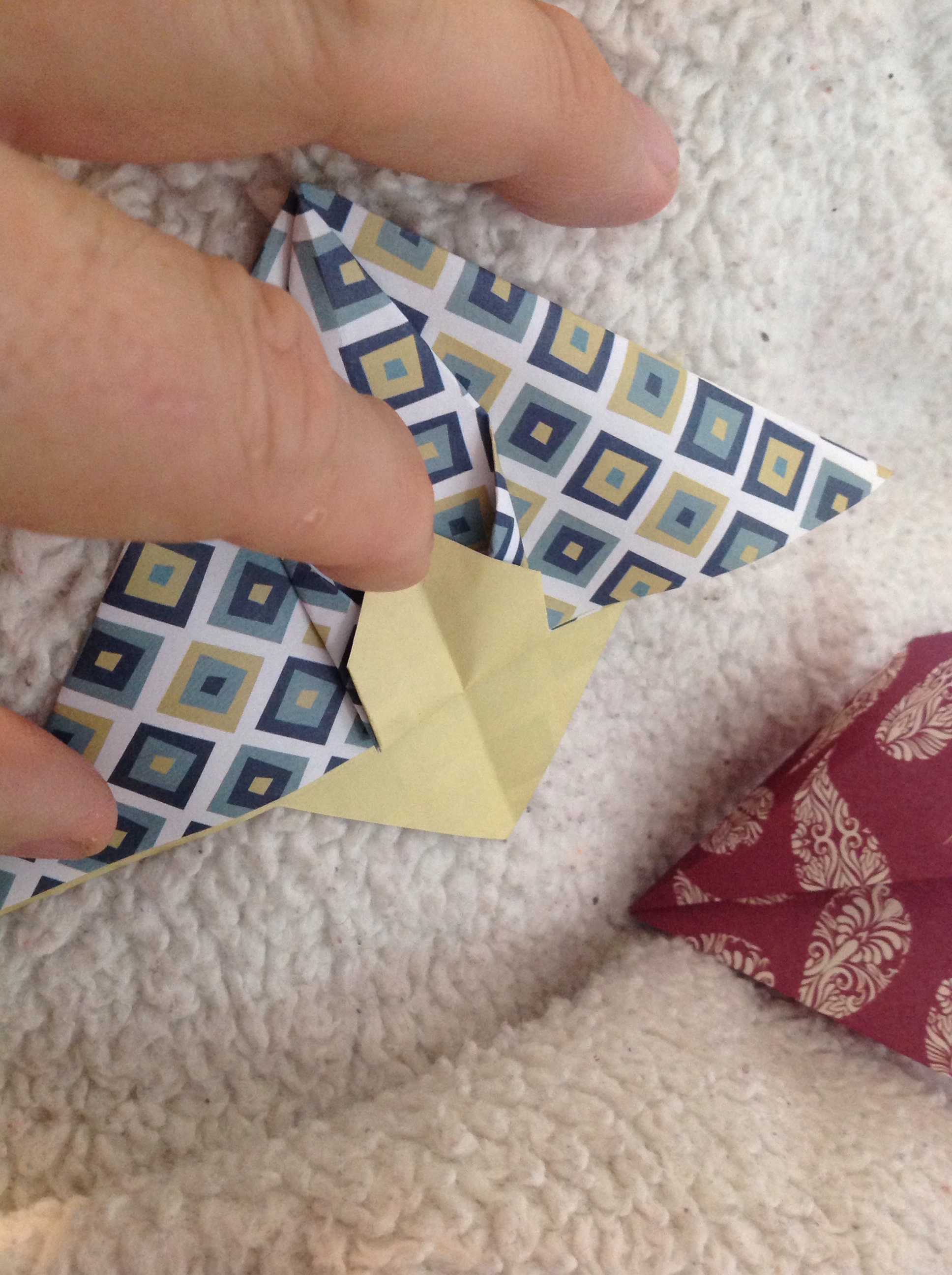 Flip the unit and tuck in the four corners. Next, fold each shield shaped side to an airplane point as shown to make the stars.