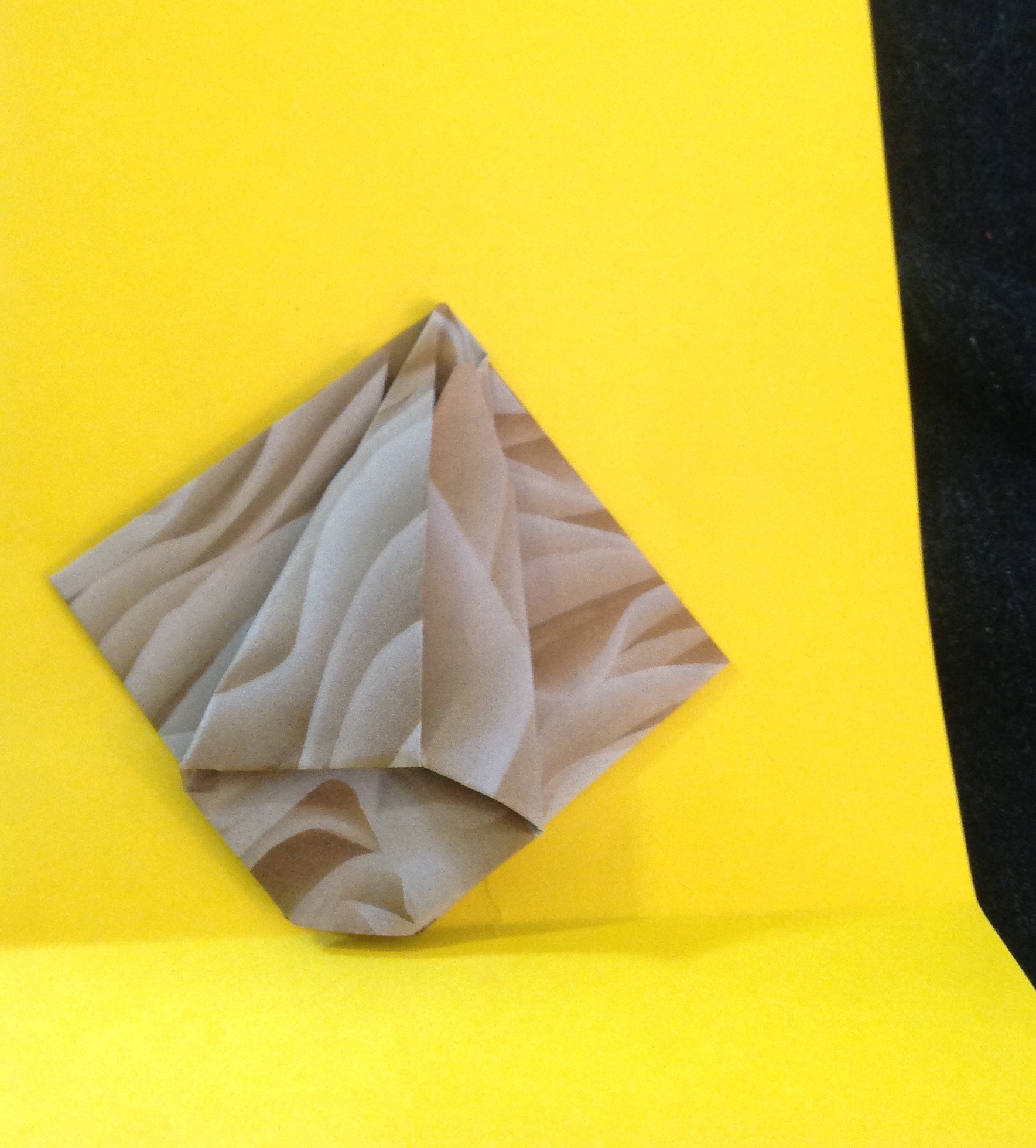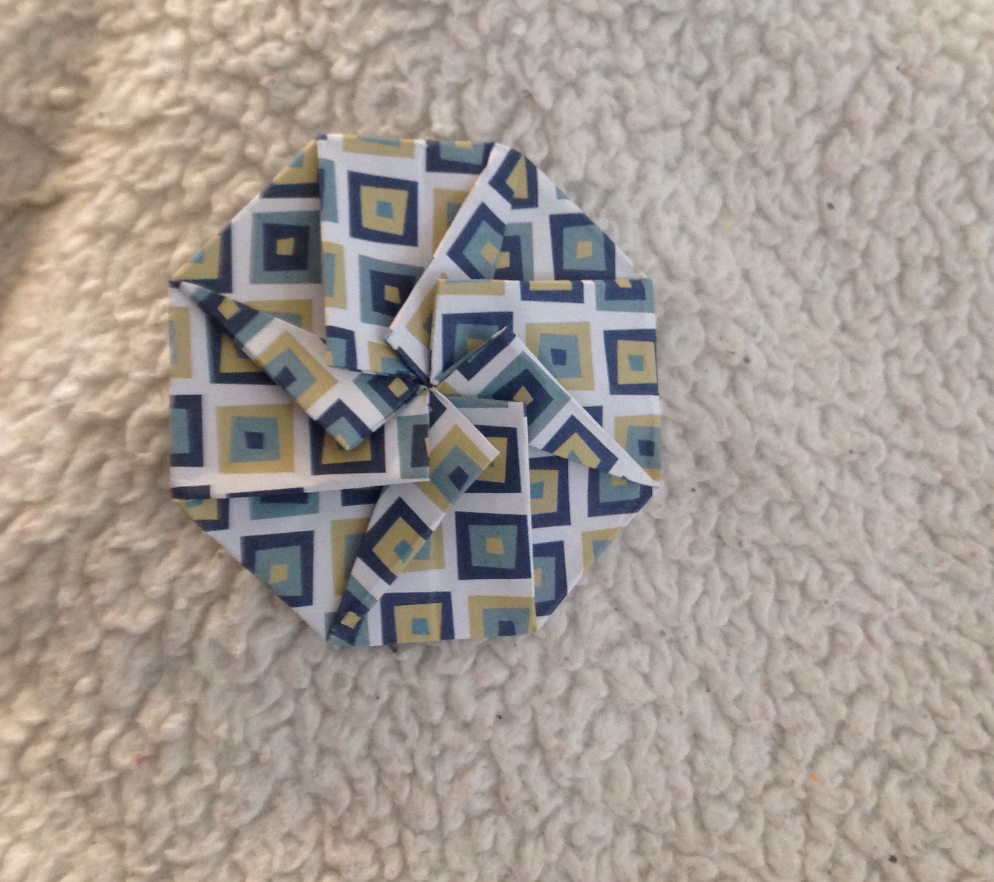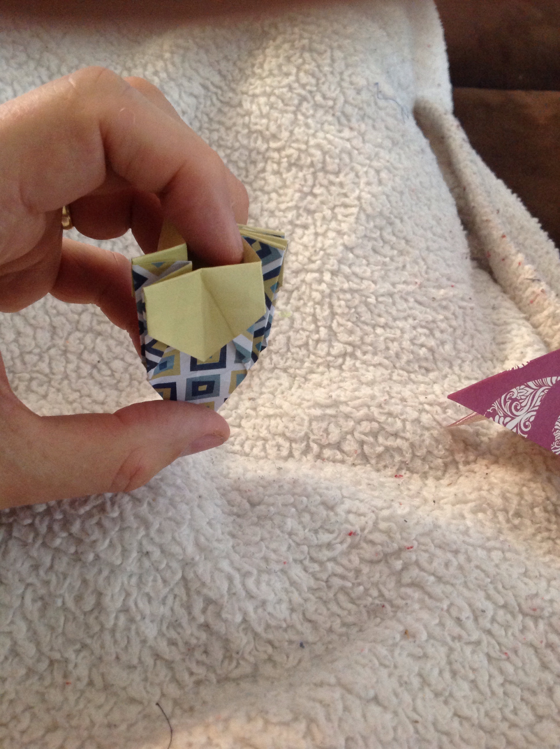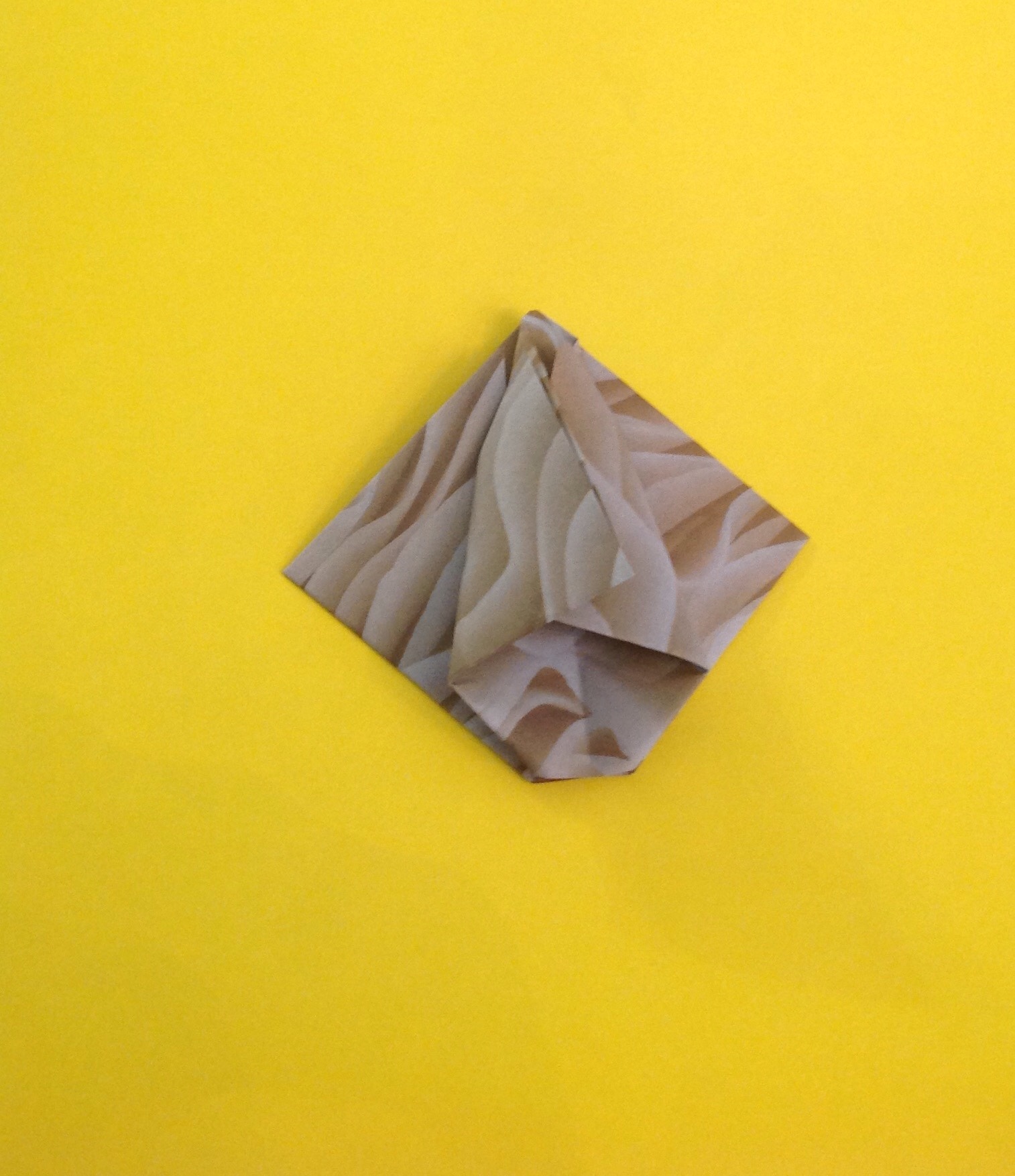 Flip the unit and tuck in the four corners. Next, fold each shield shaped side to an airplane point as shown to make the stars.