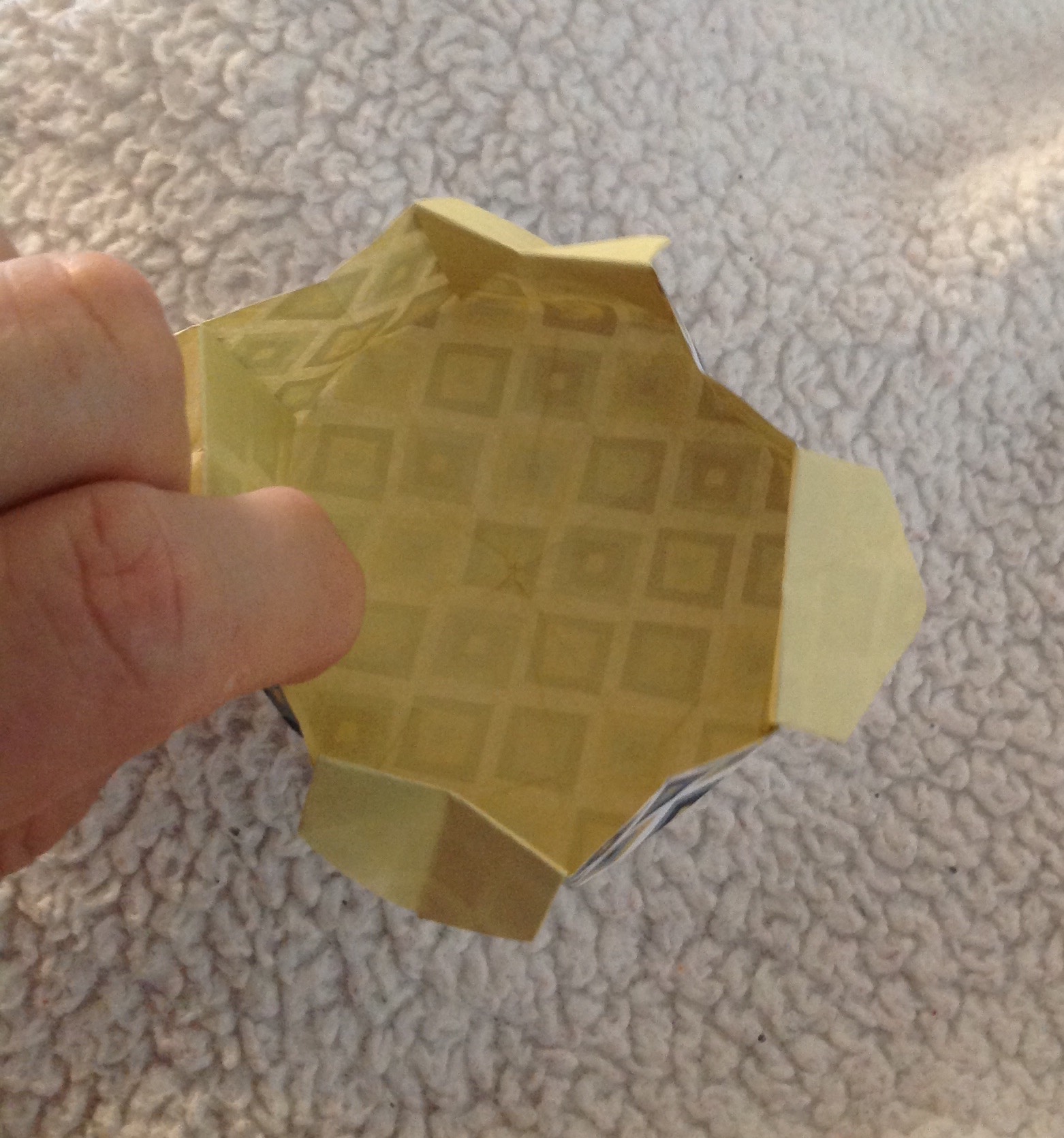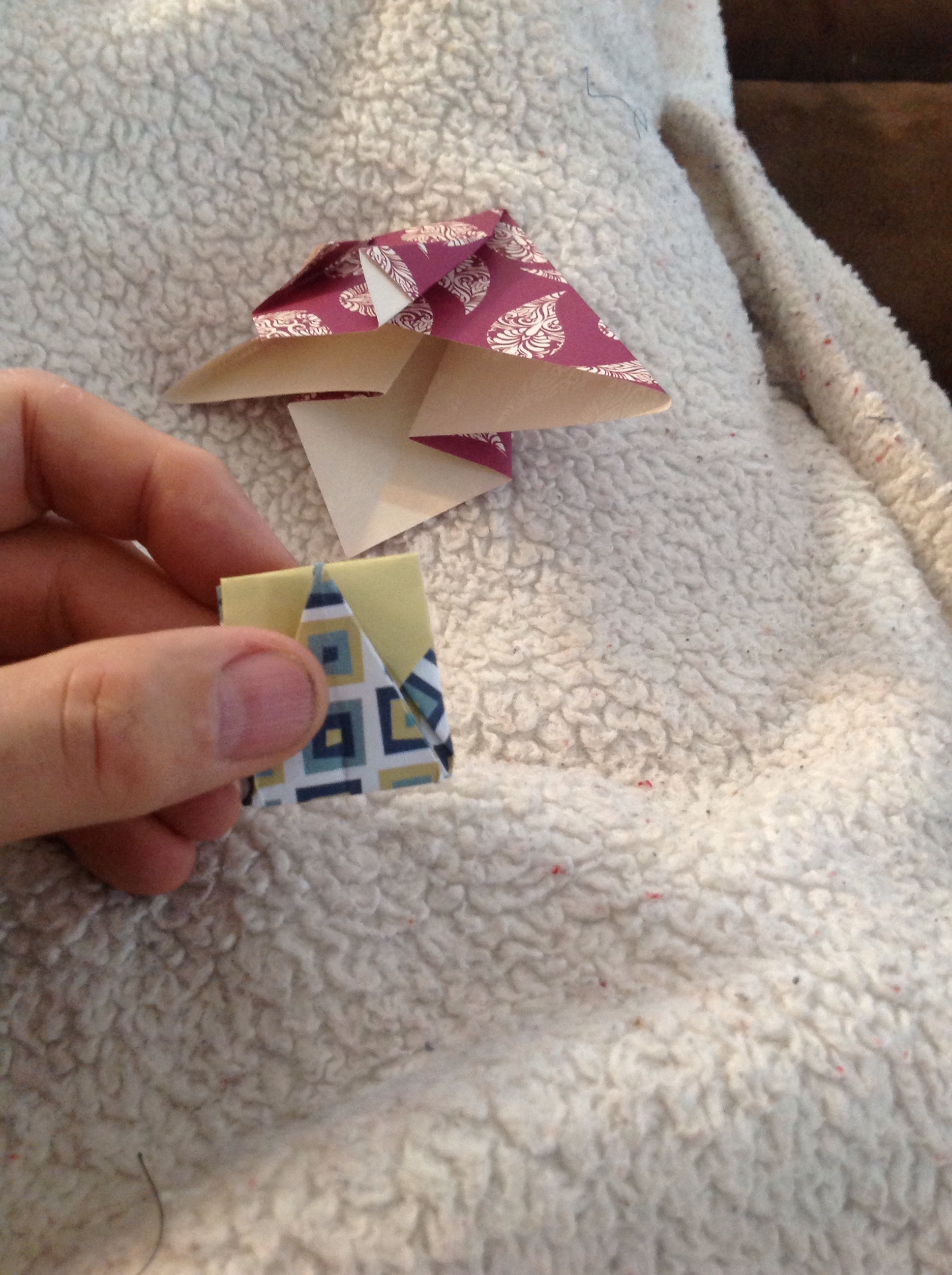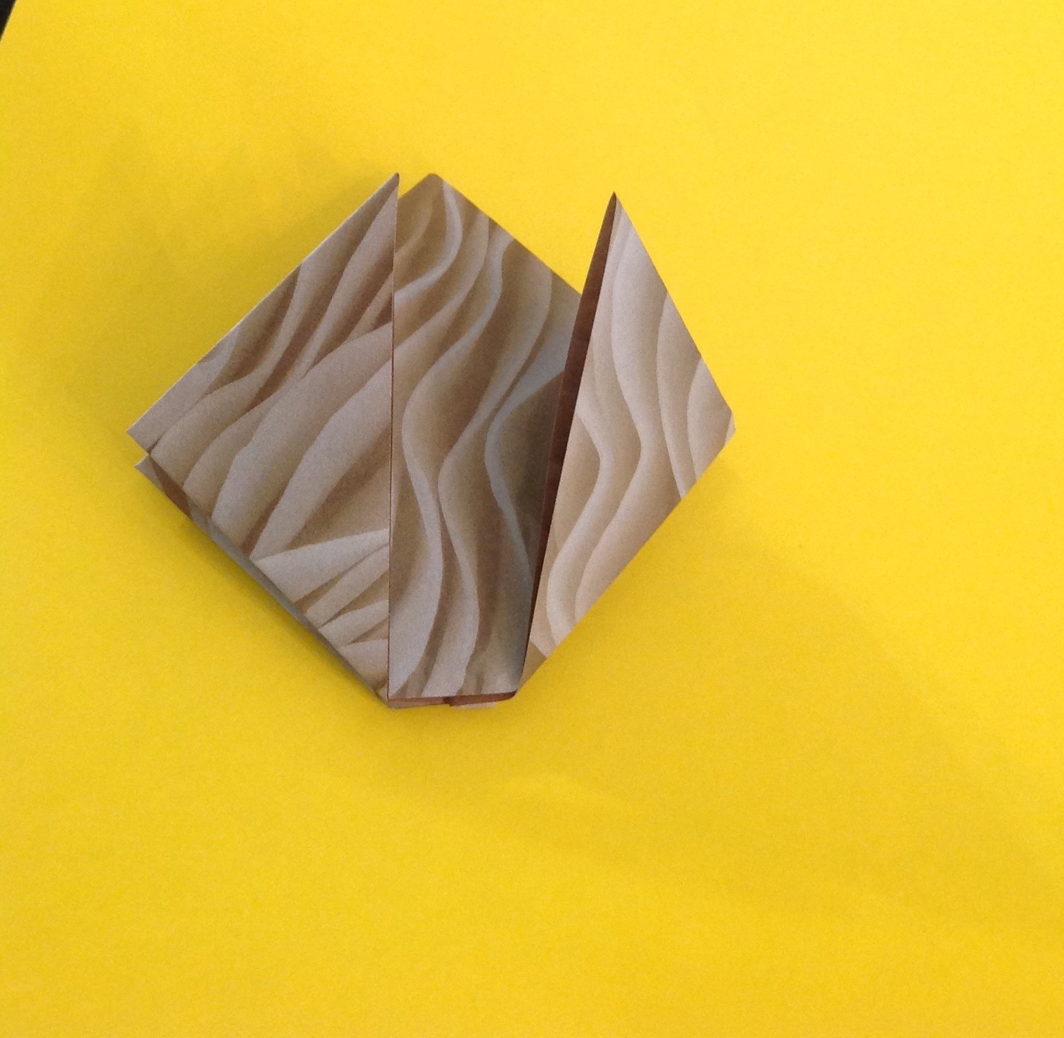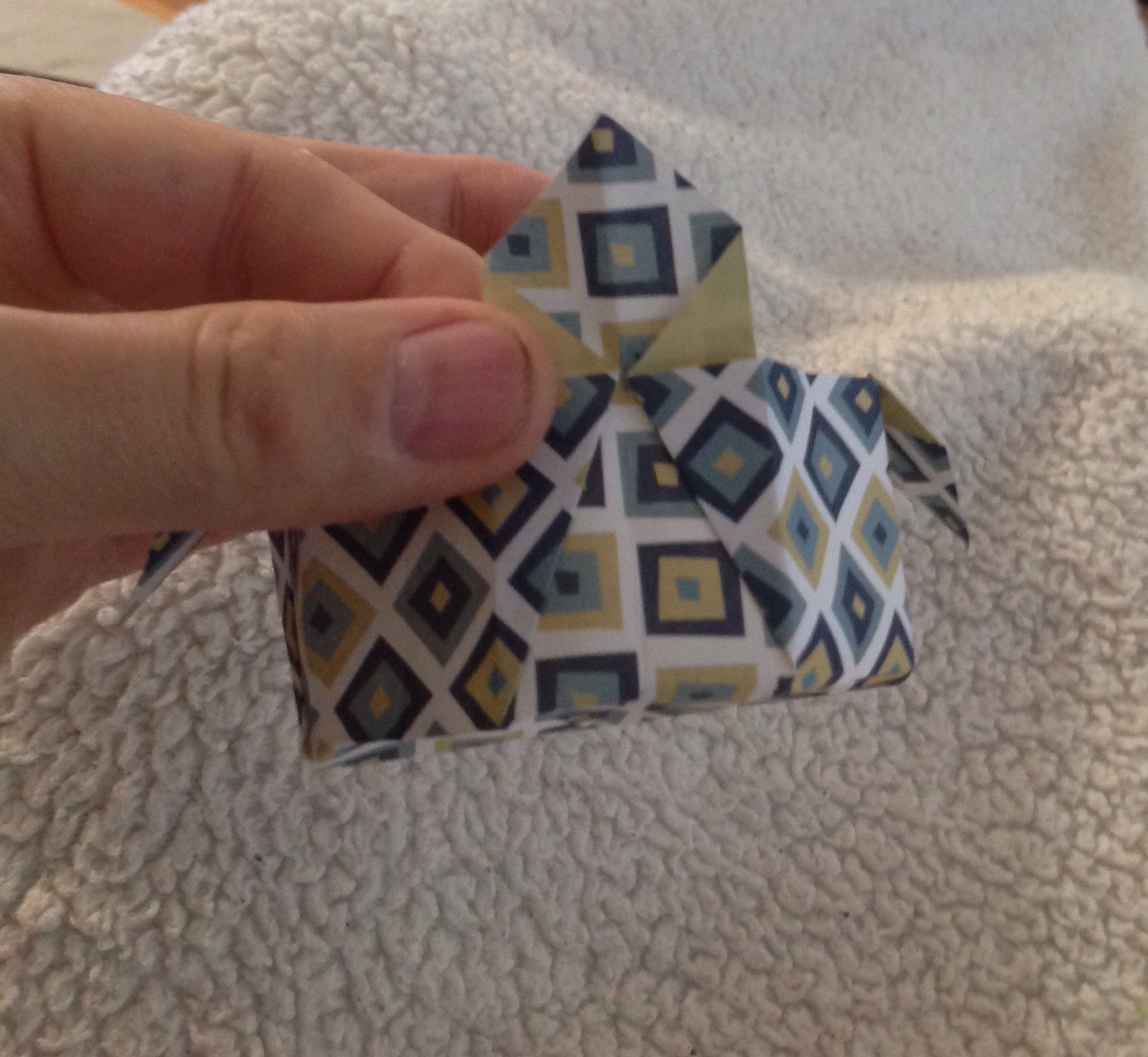 Flip the unit and tuck in the four corners. Next, fold each shield shaped side to an airplane point as shown to make the stars.