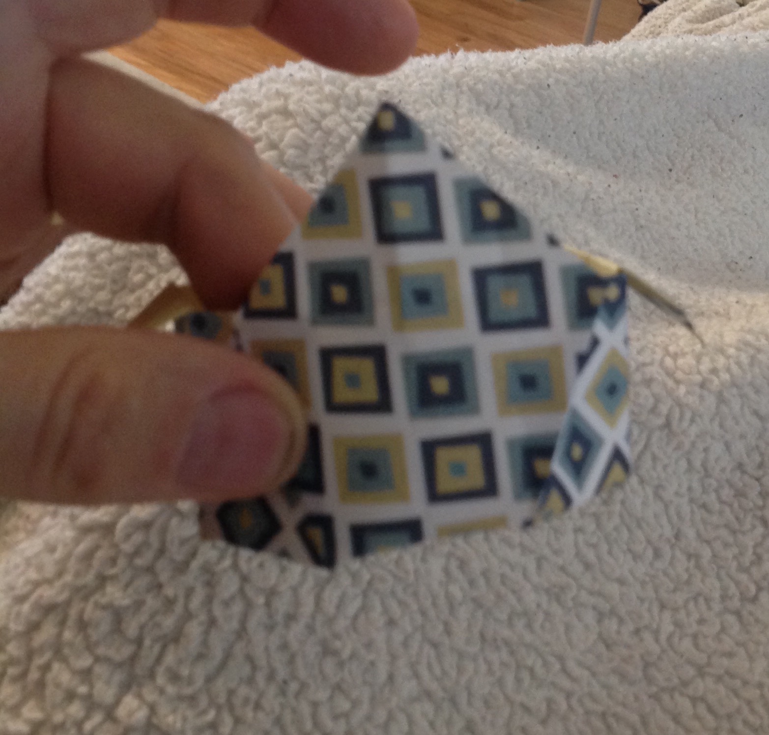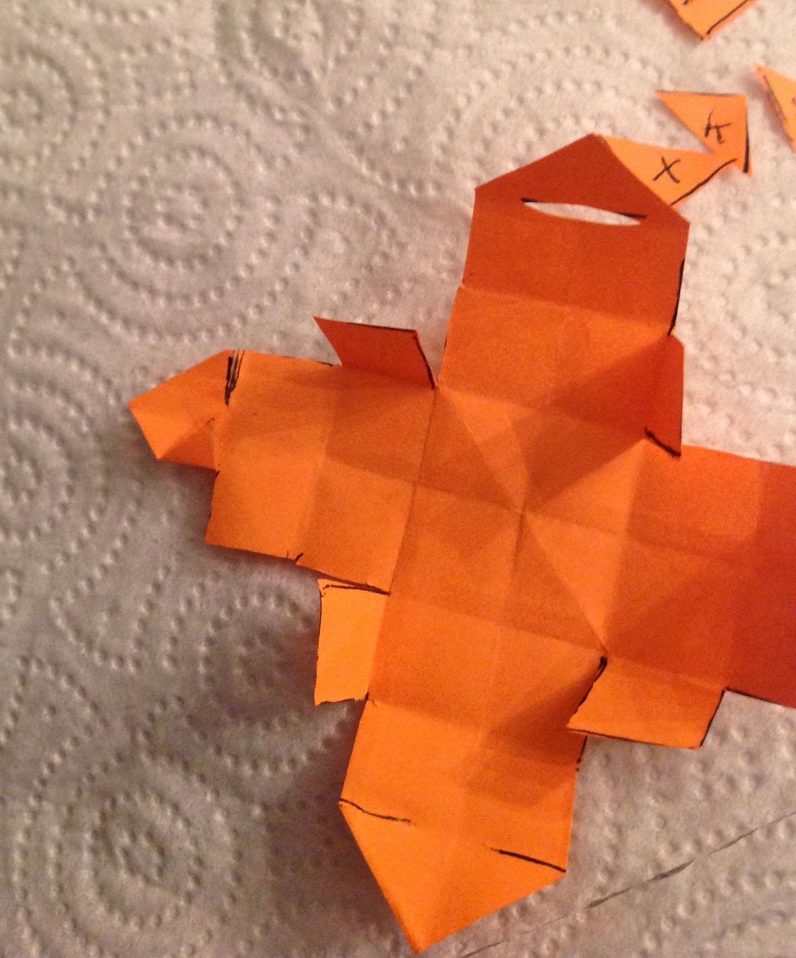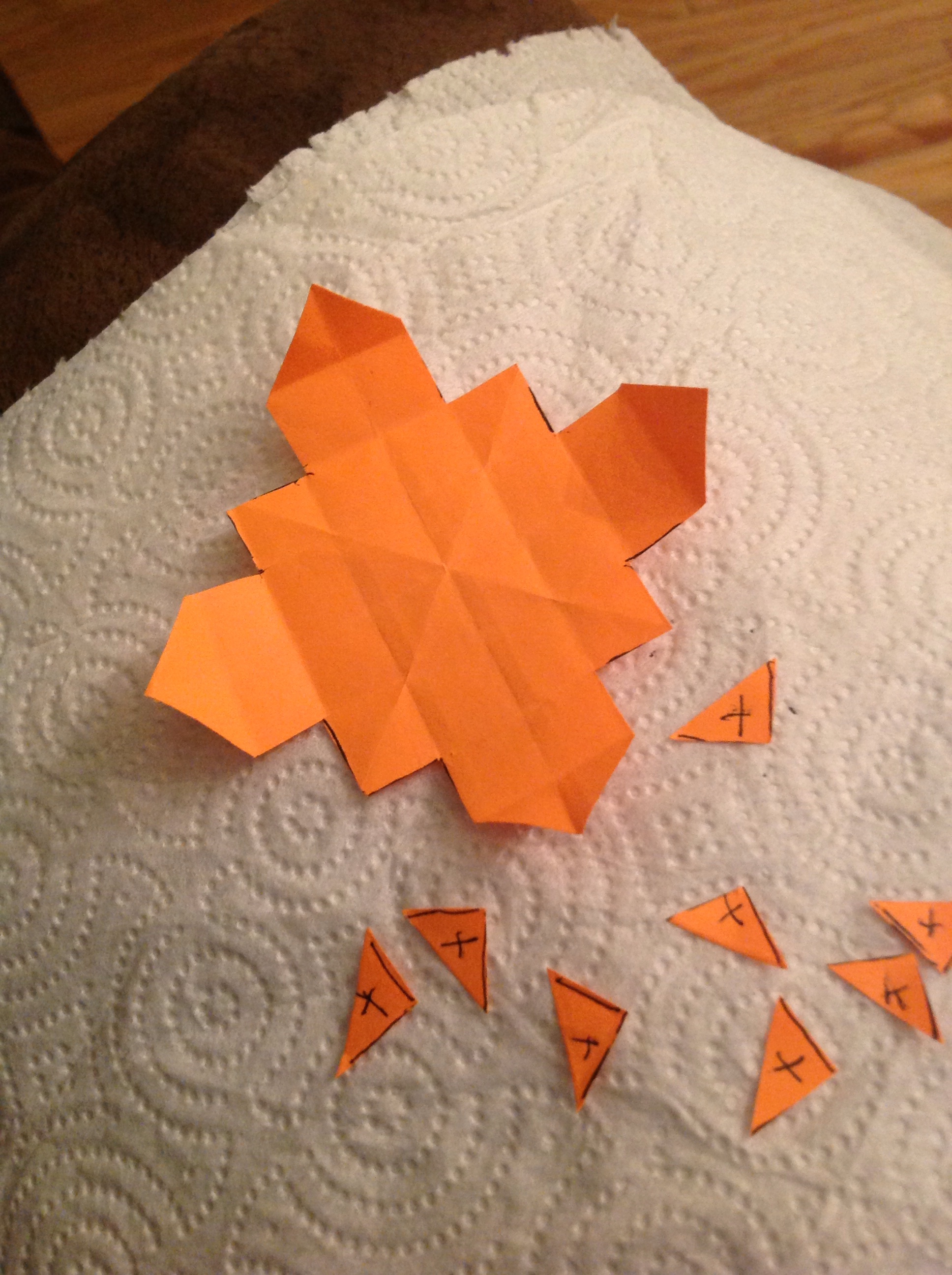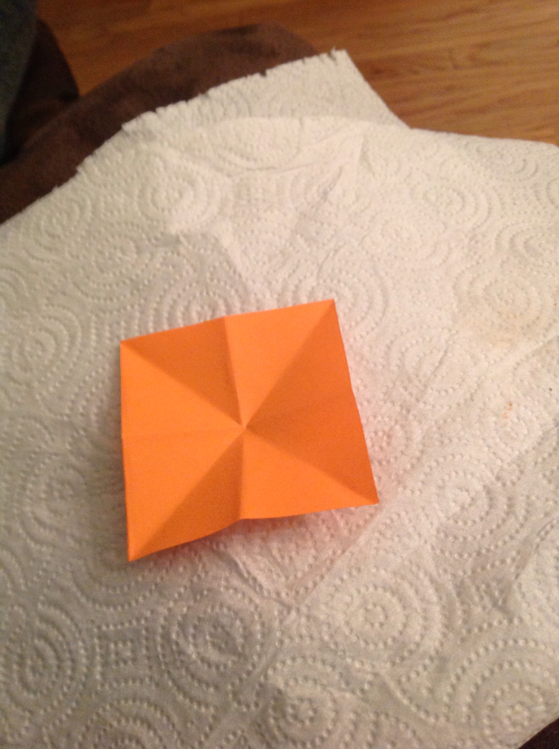 Flip the unit and tuck in the four corners. Next, fold each shield shaped side to an airplane point as shown to make the stars.