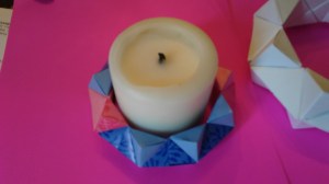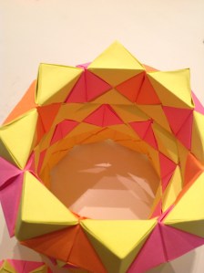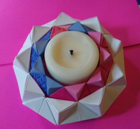 Though this project is time consuming and requires a little patience the end form is worth the effort. It can be made any size you desire according to the size of the original squares of paper used to fold the units. It could easily function as a wreath to use on a doorway or as a base to surround a candle. In what other ways could you find to use it?