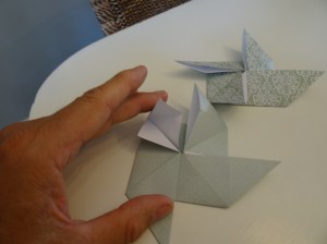 This is a rather complicated project the first time you do it. It usually takes two whole periods to teach junior high and high school students how to fold them. It’s much easier when someone is there showing you how in person. The following just tells you the basic steps of the process.