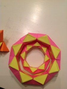 In order to create this form, however, I had to alter half of the  the eight-sided units I used to create the ring. It takes 18 units to complete the wheel. To form the linking unit I only glued it part-way leaving those units divided into two swiveling halves. Then I took the solid units and glued them in-between.