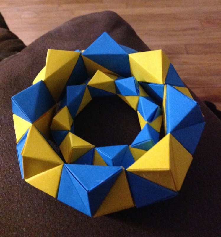 Here is a geometric form composed of 12 units. It is about the size of a baseball if you make it with squares that are created by quartering a sheet of copy paper. Of course, you will have a small strip of paper left over after folding the paper in quarters and folding it diagonally to make squares. Did you notice that the dice above were made with smaller units than the globes? These were made with squares cut from the strips leftover from the globe construction.