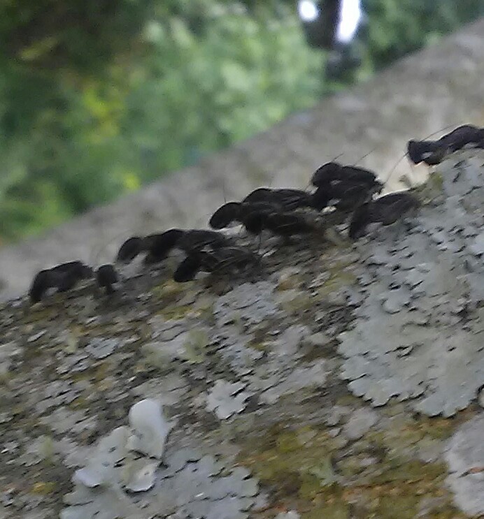 While reading up on these creatures I discovered there are two primary varieties of Barklice: Aggregating and Web Spinning. As these common names imply, one group travel around in groups while others wrap the trunks of trees in silky webbing while feeding on the bark beneath. The ones I viewed were the Aggregating variety. Apparently there are many species in each of these two larger groups. Some have wings while others do not. Some are black (like the ones pictured here), while others are yellow, green, gray or brown. Most have striped abdomen with banding similar to the bees. Some have very long antennae and others of varying size.